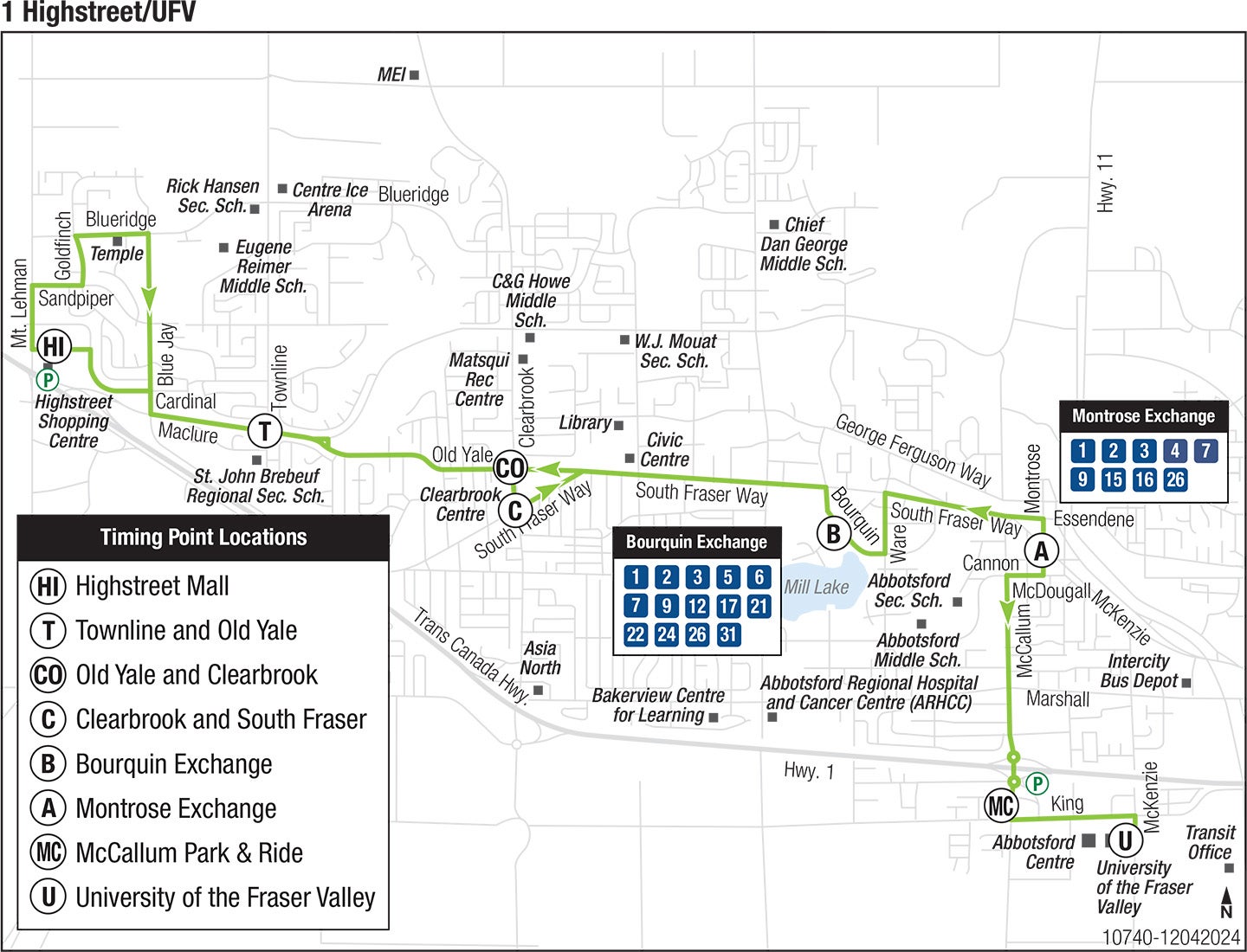 Highstreet Mall Maclure Rd at Townline Rd South Fraser Way at Clearbrook Rd Bourquin Exchange Montrose Exch McCallum Park & Ride UFV Abbotsford Campus
