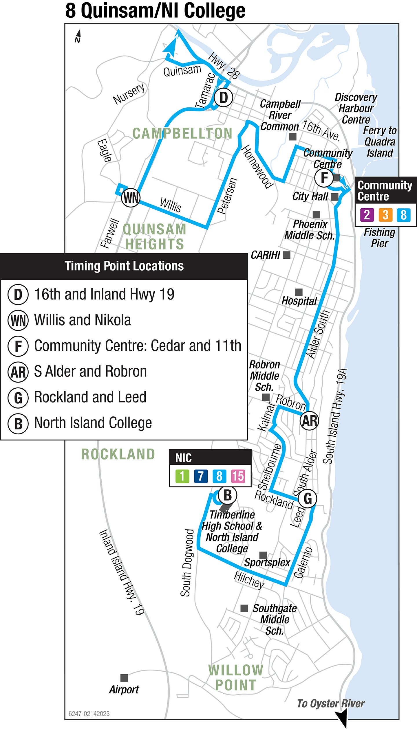 16th and S Island Hwy 19 Willis at Nikola Community Centre: Cedar at 11th S. Alder at Robron Rockland at Leed College at Timberline