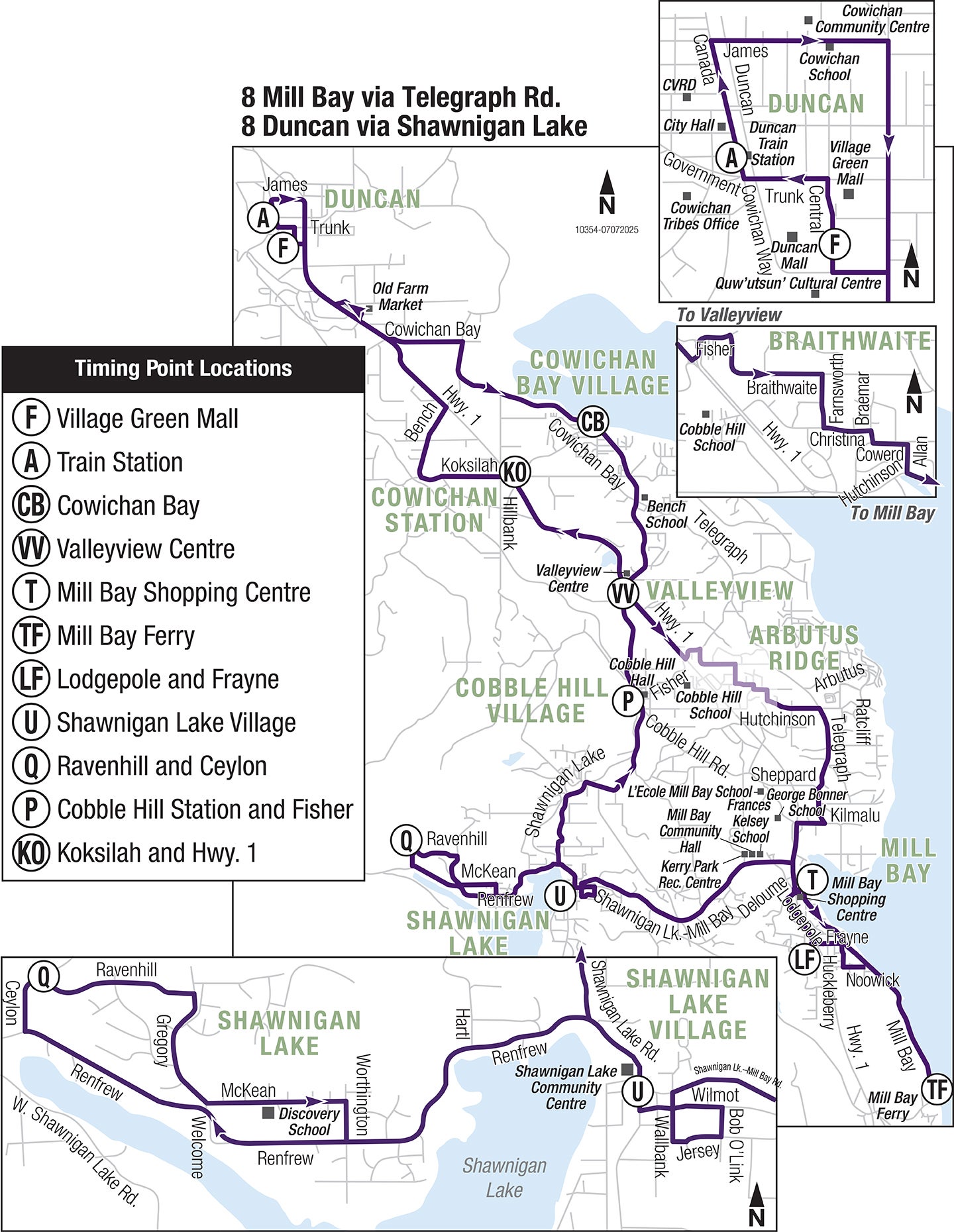 Route 8: Mill Bay via Telegraph Rd/Duncan via Shawnigan Lk