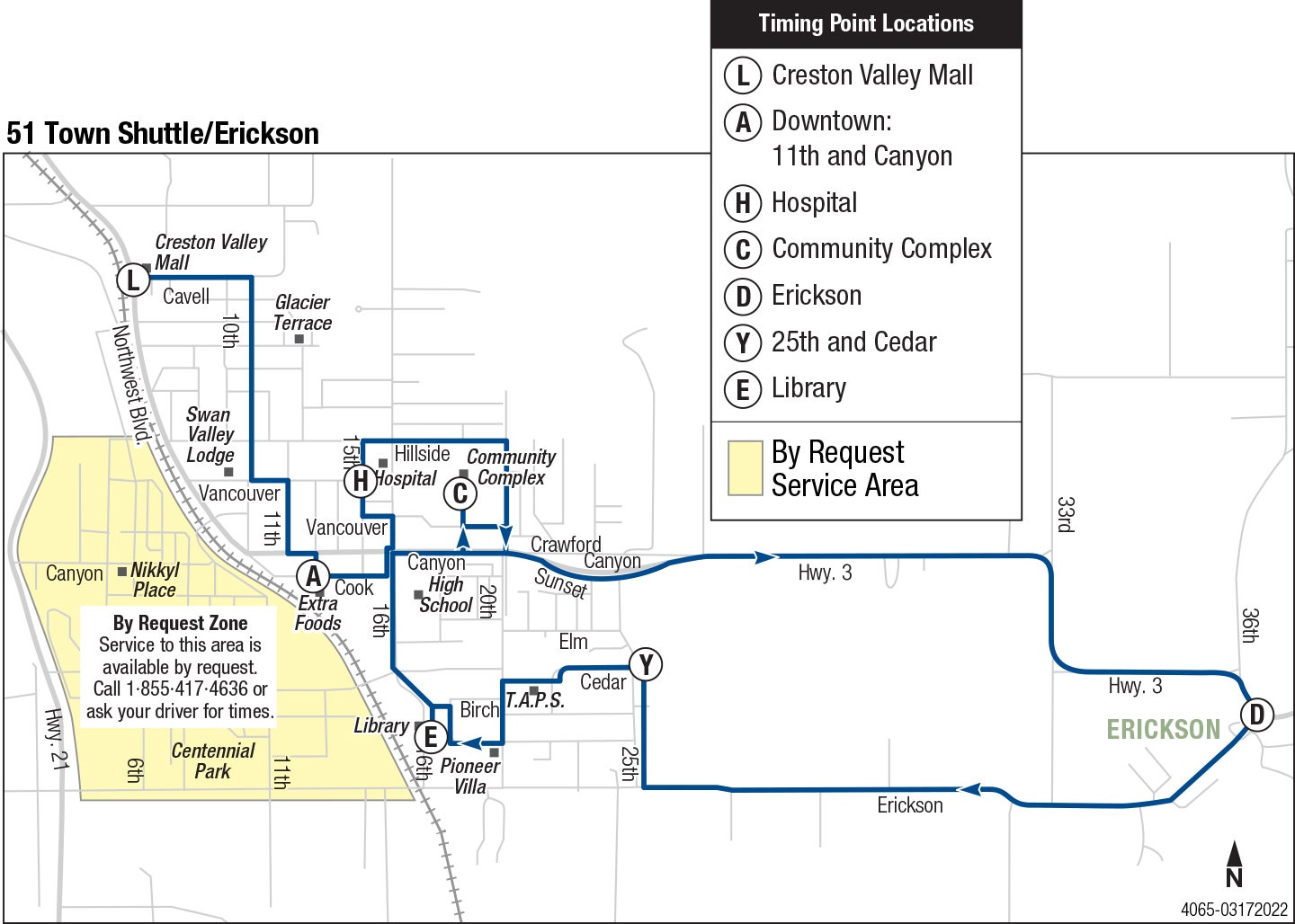 Route Via Trip Notes 11 Ave and Canyon Creston Valley Hospital Creston Community Complex Creston Community Complex Erickson: Hwy 3 and 36 Ave 25 Ave and Cedar Creston Public Library Creston Community Complex Creston Community Complex Creston Valley Hospital 11 Ave and Canyon