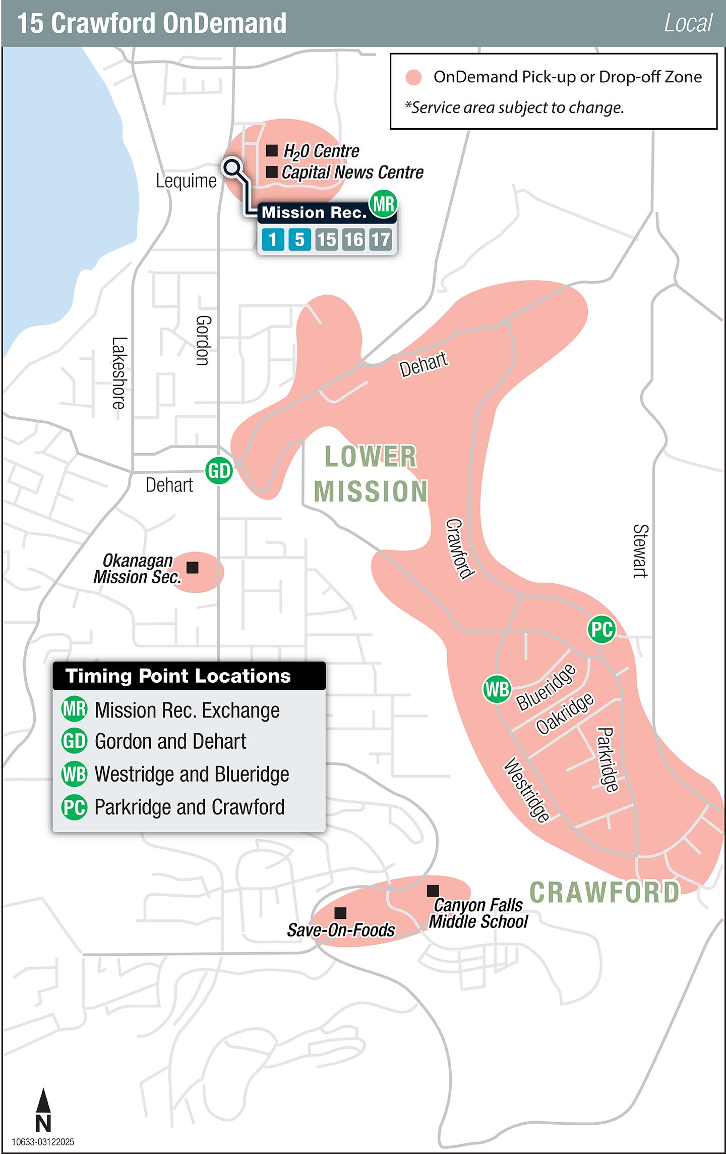OnDemand uses a dynamic routing system and trips need to be booked through the BC Transit OnDemand app or by phone with a booking agent during business hours.