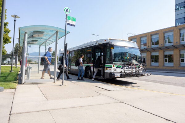 Bus stops look a little different depending on how they’re used. Some have shelters or benches, while others are marked with a bus stop sign. Many signs also list the routes that stop there. Look for the BC Transit sign, which typically looks like this: