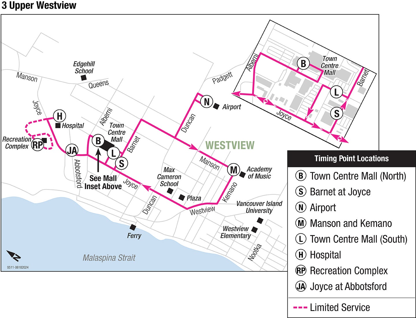 Route Via Town Centre Mall Exchange Barnet at Joyce Powell River Airport Manson at Kemano Town Centre Mall (South) qathet General Hospital Powell River Recreation Complex Joyce at Abbotsford Town Centre Mall Exchange