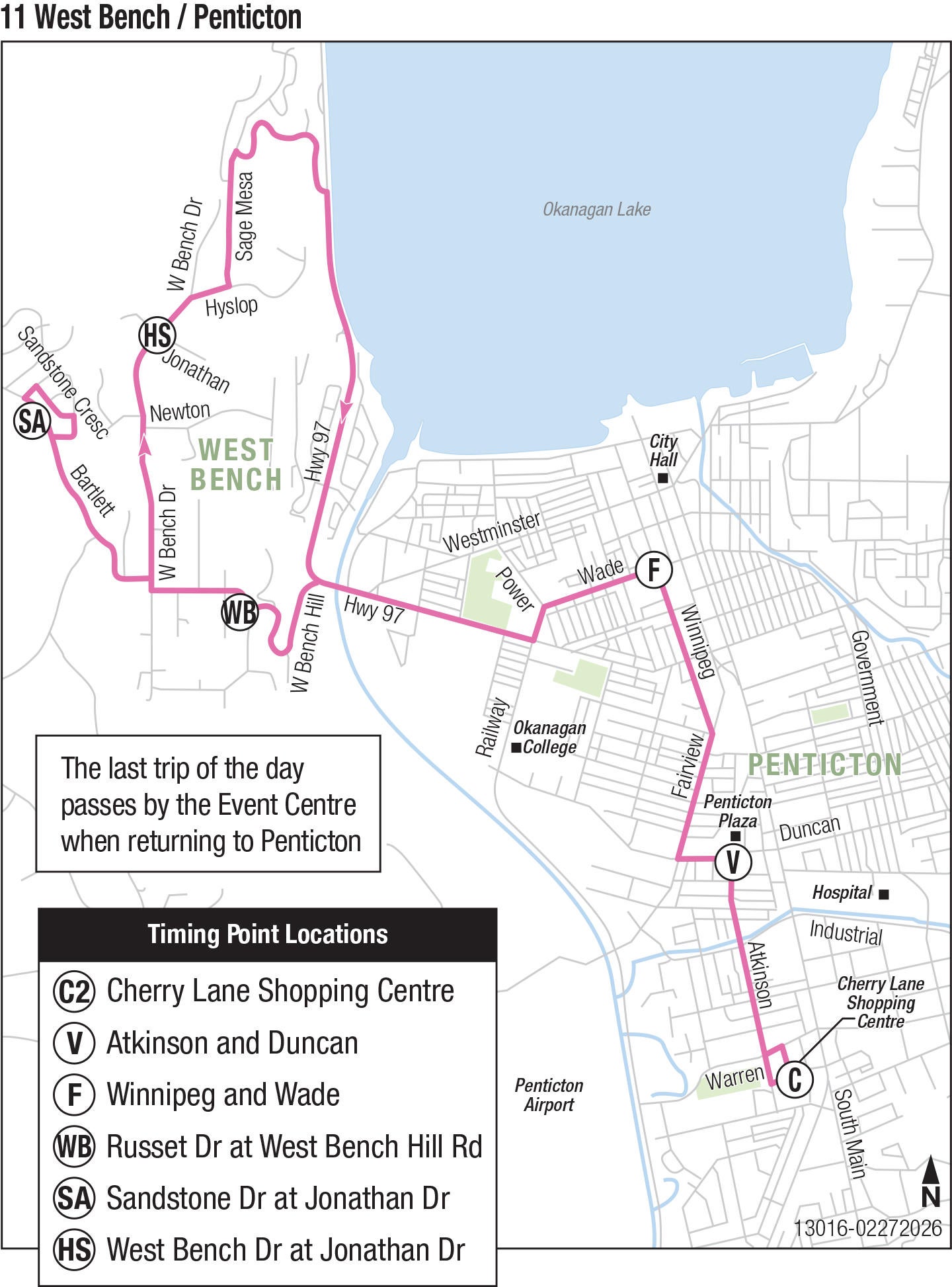 | Route | Cherry Lane Shopping Centre (The Bay) | Atkinson and Duncan | Winnipeg and Wade | West Bench Hill at Russet Dr | Sandstone Dr at Bartlett Dr |
