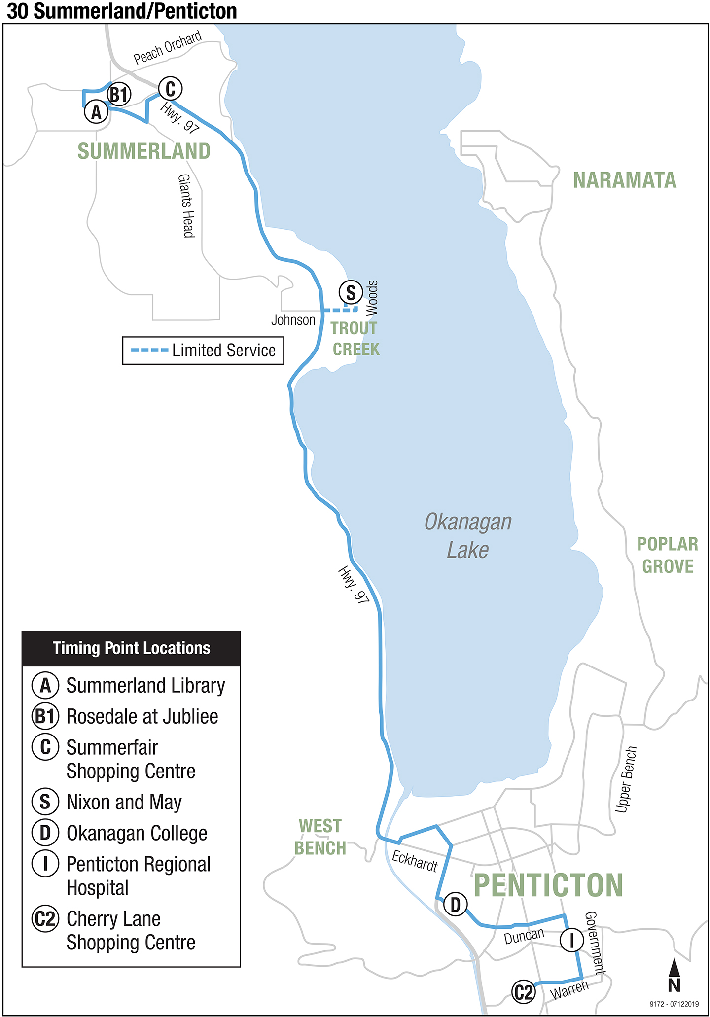 Route Via Cherry Lane Shopping Centre (Warren Ave) Penticton Reg. Hospital (on Government) Okanagan College Trout Creek: Nixon and May Summerfair Shopping Centre Summerland: Rosedale at Jubilee Summerland Library (Wharton and Kelly)