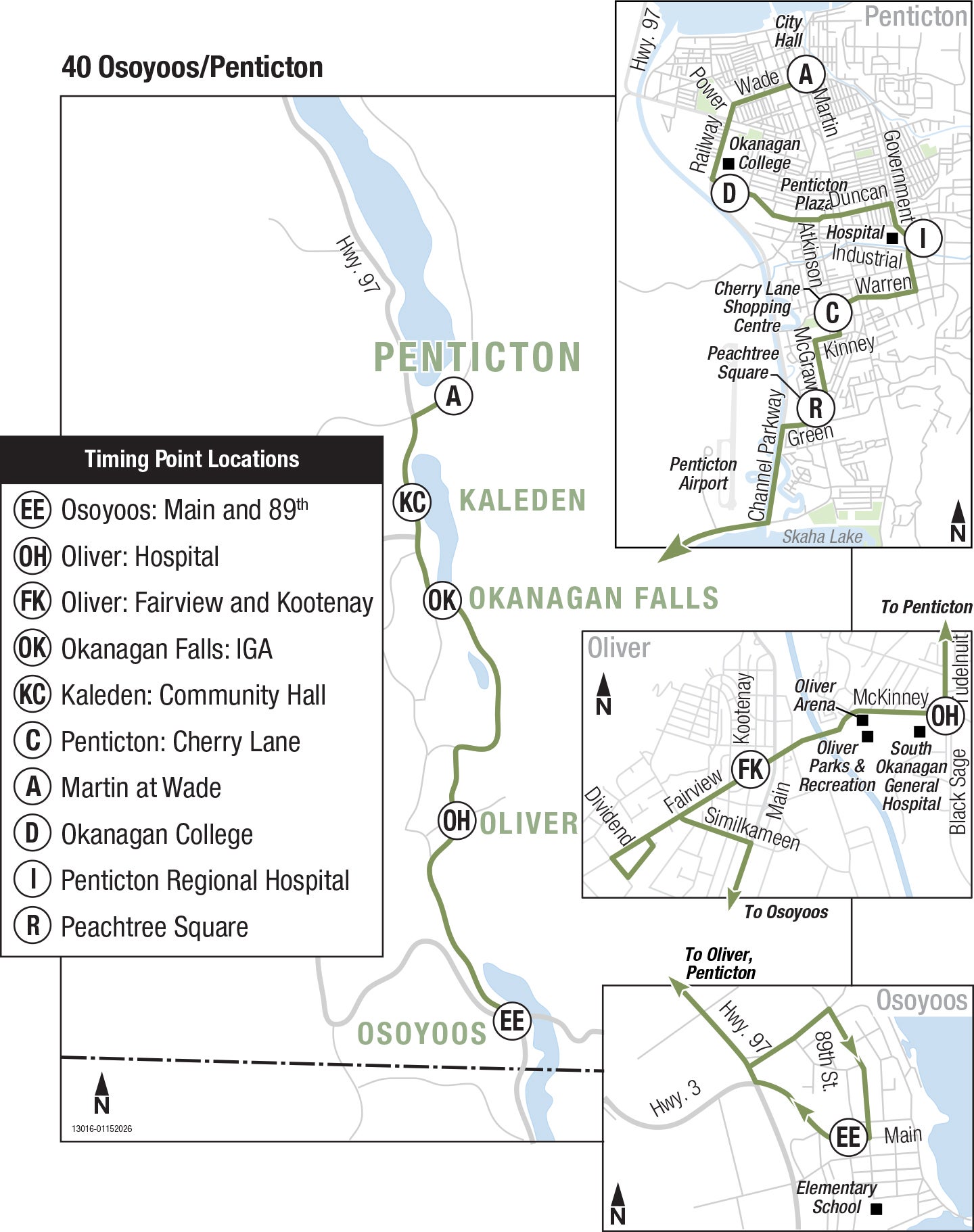| Route | Osoyoos: Main and 89th St. | Oliver: Fairview at Kootenay | Oliver Hospital | Okanagan Falls: Post Office | Kaleden Fire Hall (Request Only) | Peachtree Square e | Cherry Lane Shopping Centre (Warren Ave) e | Penticton Reg. Hospital (on Government) e | Okanagan College e | Wade and Martin e |