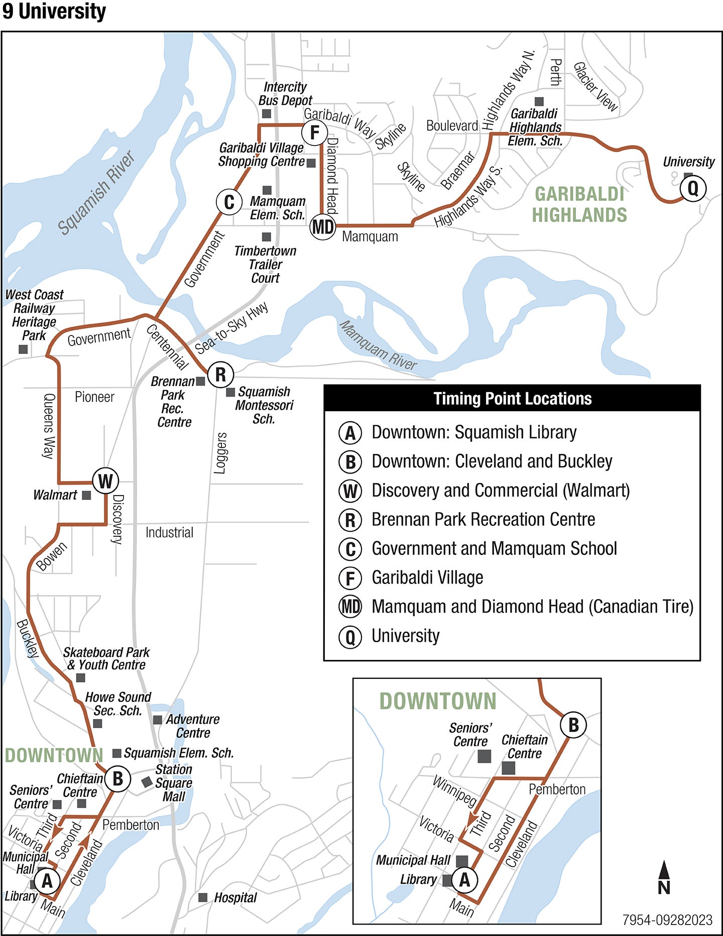 Route Via University Mamquam at Diamond Head (Canadian Tire) Squamish: Highland Mall Government at Mamquam School Brennan Park Recreation Centre Discovery Way at Commercial Way (Walmart Cleveland at Buckley Squamish Library