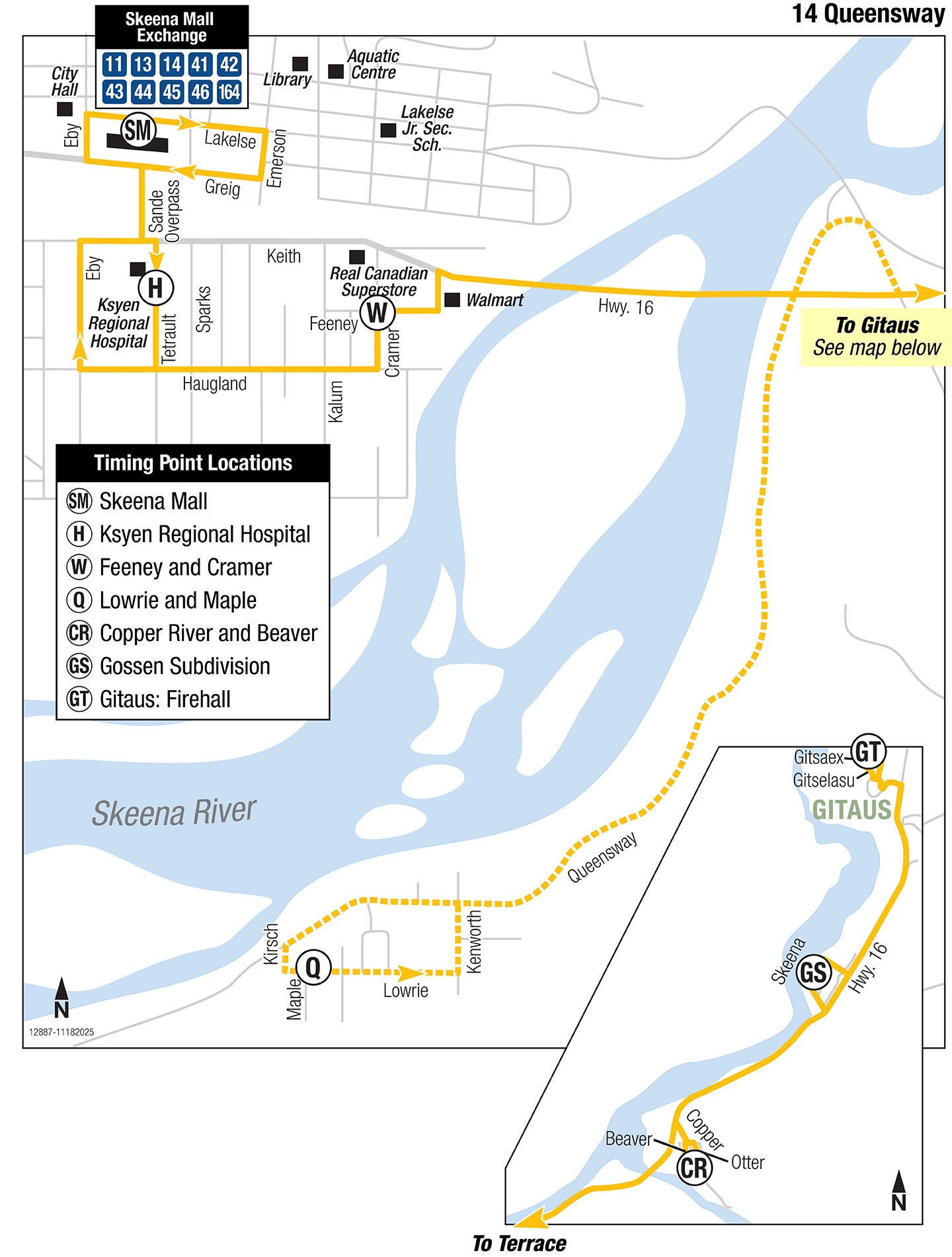 Route Via Terrace: Skeena Mall Ksyen Regional Hospital Walmart Lowrie and Queensway Otter and Copper River Rd Gossen Subdivision Gitaus Firehall Walmart Ksyen Regional Hospital Terrace: Skeena Mall