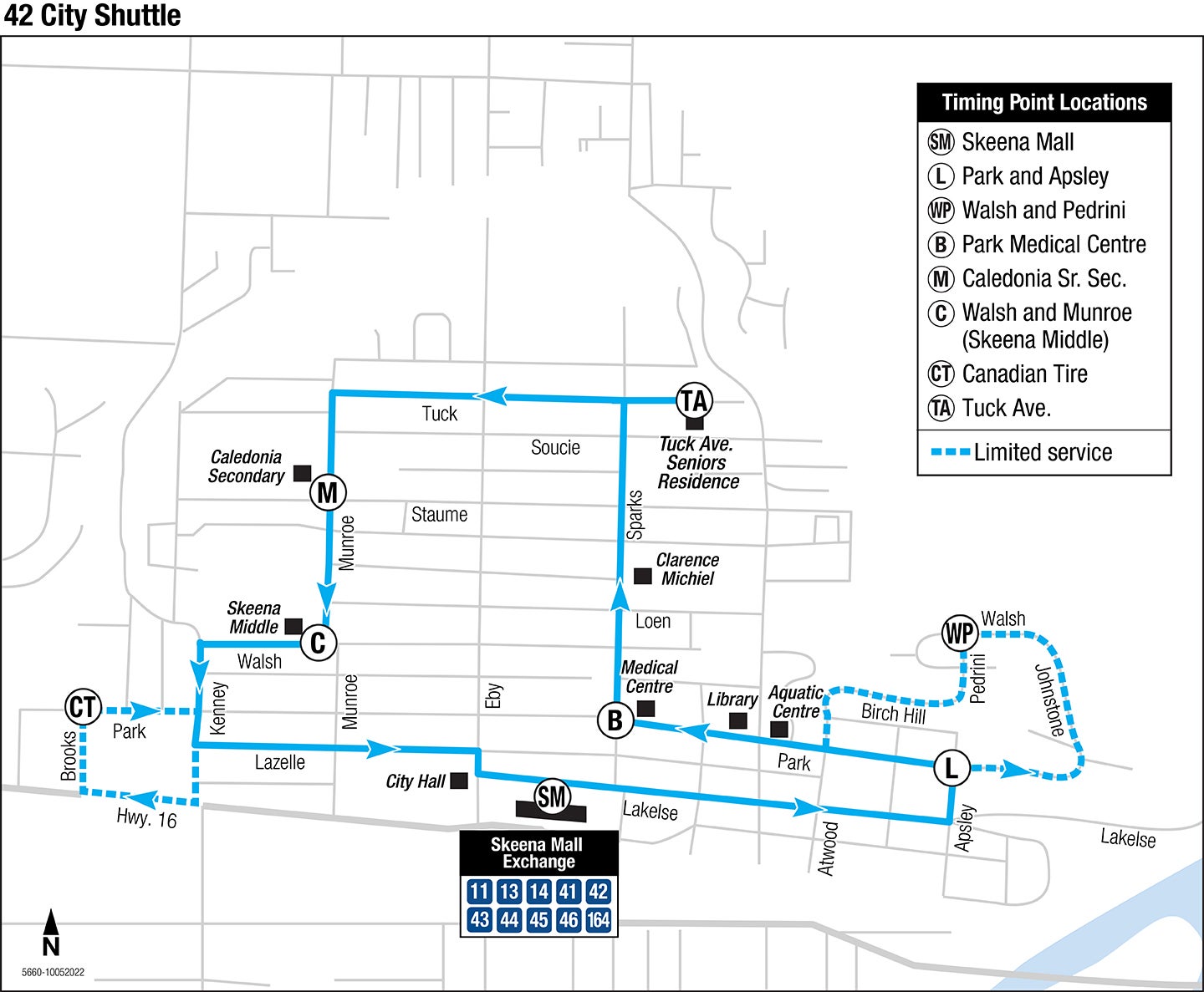 Route Via Terrace: Skeena Mall Park and Apsley Park Medical Centre Tuck Ave Senior Citizens Residence Caledonia Senior Secondary Walsh and Munroe Canadian Tire Terrace: Skeena Mall