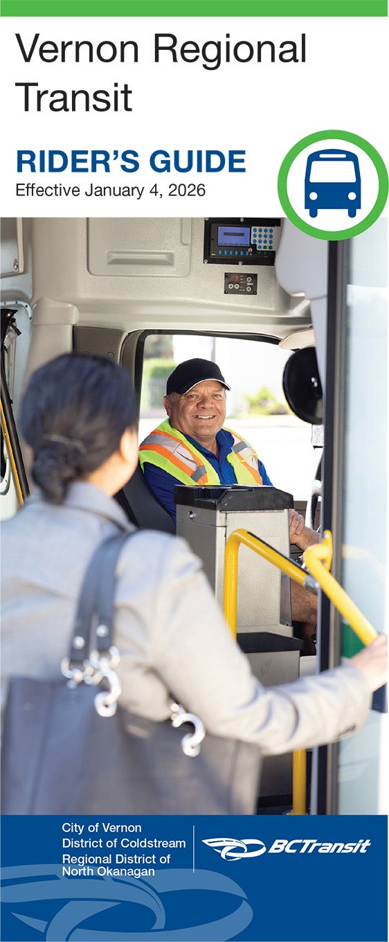 Rider’s Guide: This handy guide lists route schedules, maps and other important transit information. Available on board or contact your local BC Transit system.