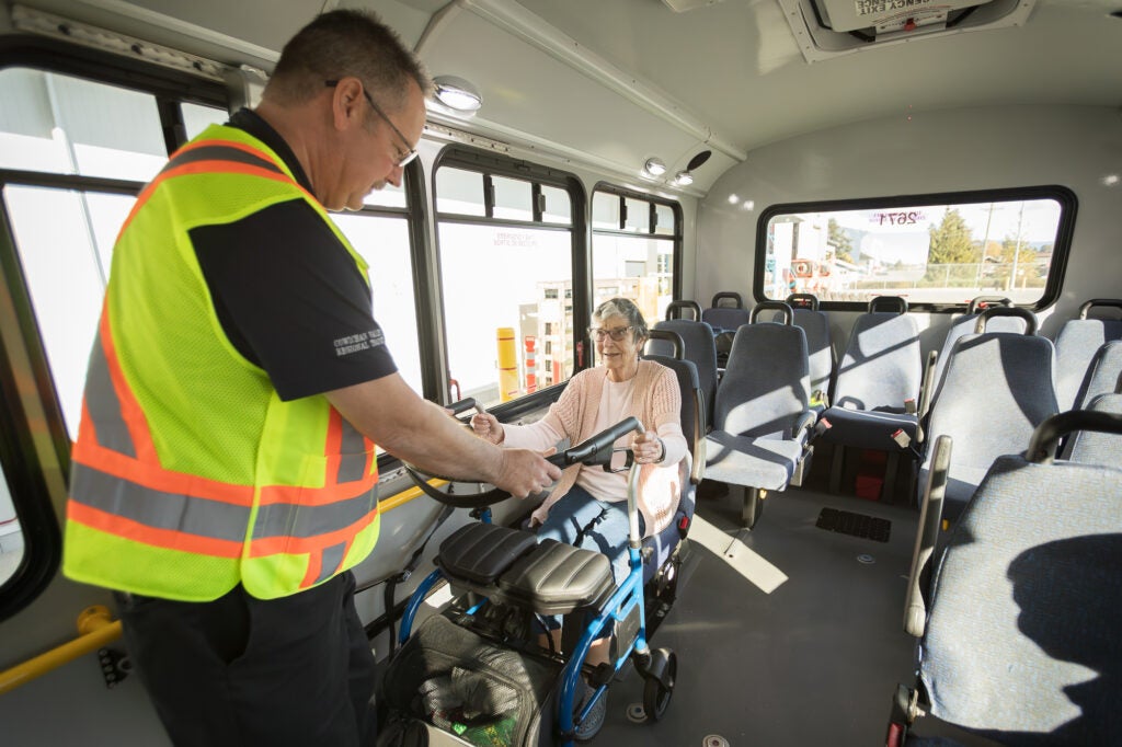 BC Transit’s low-floor buses are accessible to those using mobility aids. A low-floor bus can kneel to lower the entry level of the bus. The bus also has a loading ramp to help you get on and off the bus.
