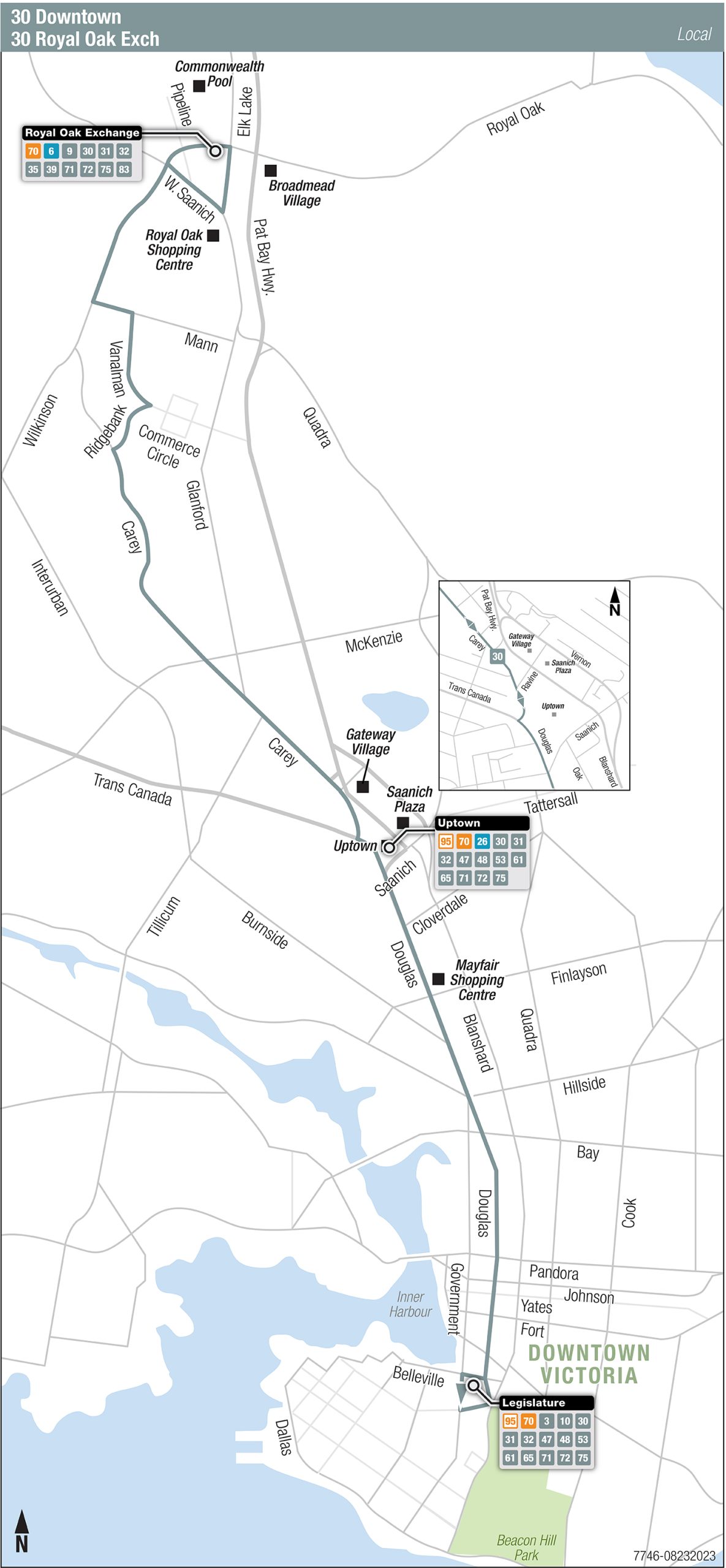 Route Via Legislature Exch (Belleville St) Douglas St at Kings Rd Carey Rd at Ravine Way - Uptown Ridgebank Cres at Vanalman Ave Glanford Ave at Vanalman Ave Royal Oak Exch