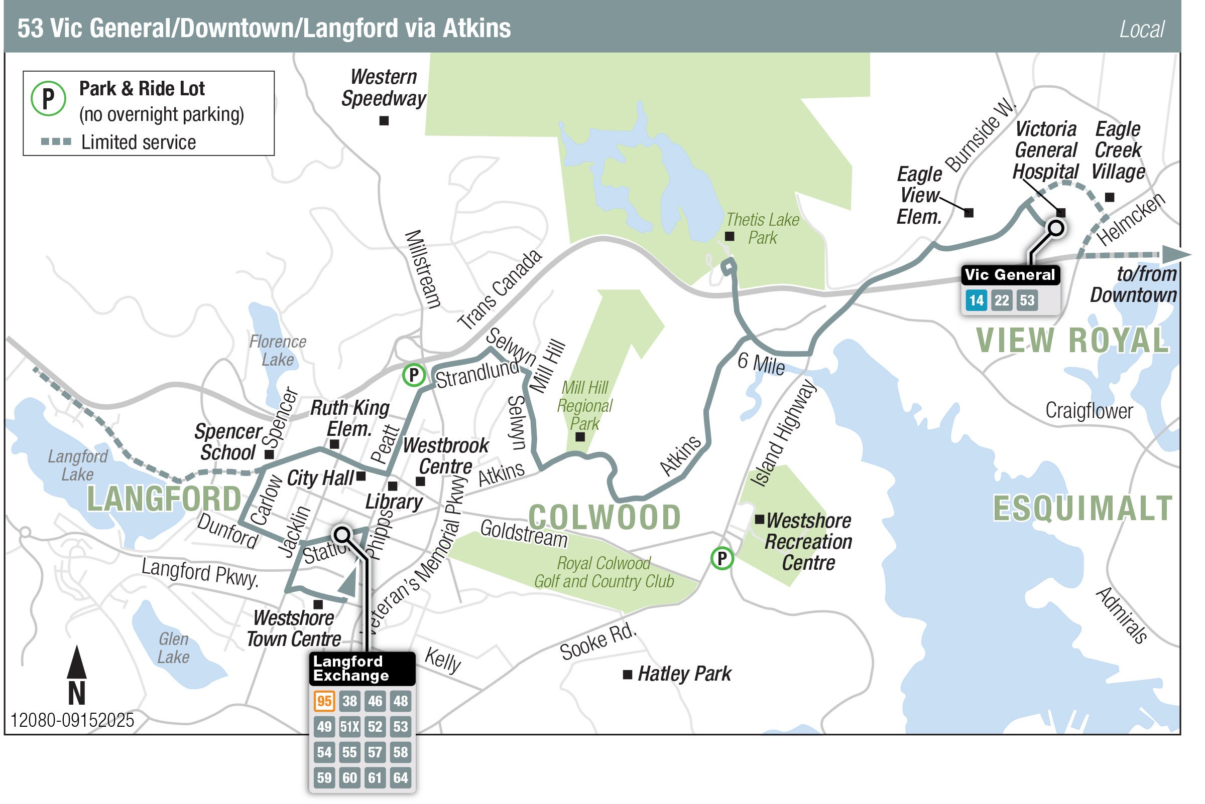 Langford Exch West end of Goldstream Ave Peatt Rd at Goldstream Ave Atkins Ave at Selica Rd Thetis Lake Parking Lot Victoria General Hospital