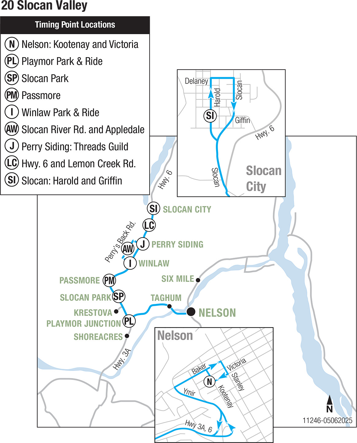 Nelson Exchange Nelson Park & Ride Taghum Beasley Rd at Bains Rd Brown Rd at Bonnington Rd Playmor Junction Park & Ride Slocan Park: Slocan Valley Co-op Passmore Winlaw Perry's Back Rd and Appledale Rd Perry Siding: Threads Guild Hwy 6 and Lemon Creek Rd Slocan City: Harold and Giffin